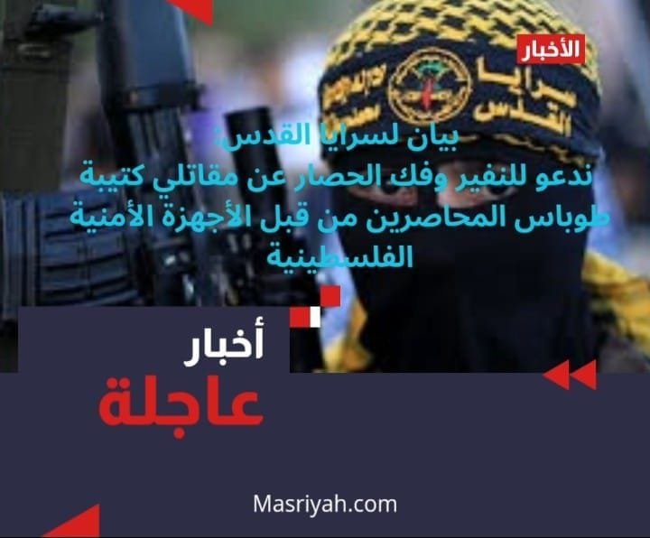 أعلنت سرايا القدس، الجناح العسكري لحركة الجهاد الإسلامي، بأن مقاتليها في طوباس بالضفة الغربية يعانون من الحصار والملاحقة من أجهزة أمن السلطة الفلسطينية.