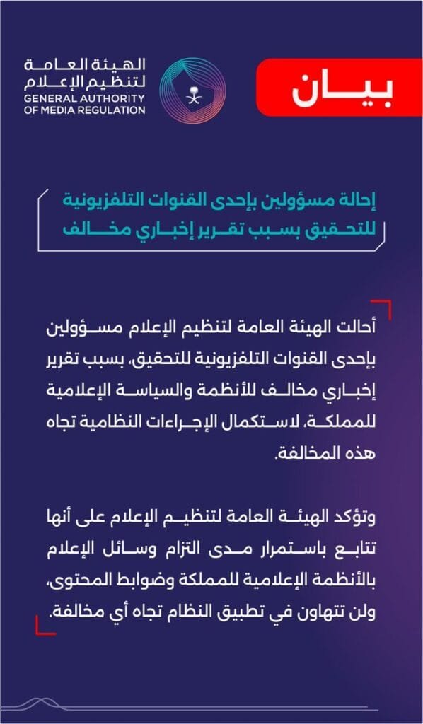 أعلنت الهيئة العامة لتنظيم الإعلام في المملكة العربية السعودية عن إحالة مسؤولين بإحدى القنوات التليفزيونية للتحقيق، بسبب تقرير إخباري مخالف للأنظمة والسياسة الإعلامية للمملكة. تأتي هذه الخطوة في إطار استكمال الإجراءات النظامية تجاه المخالفات.